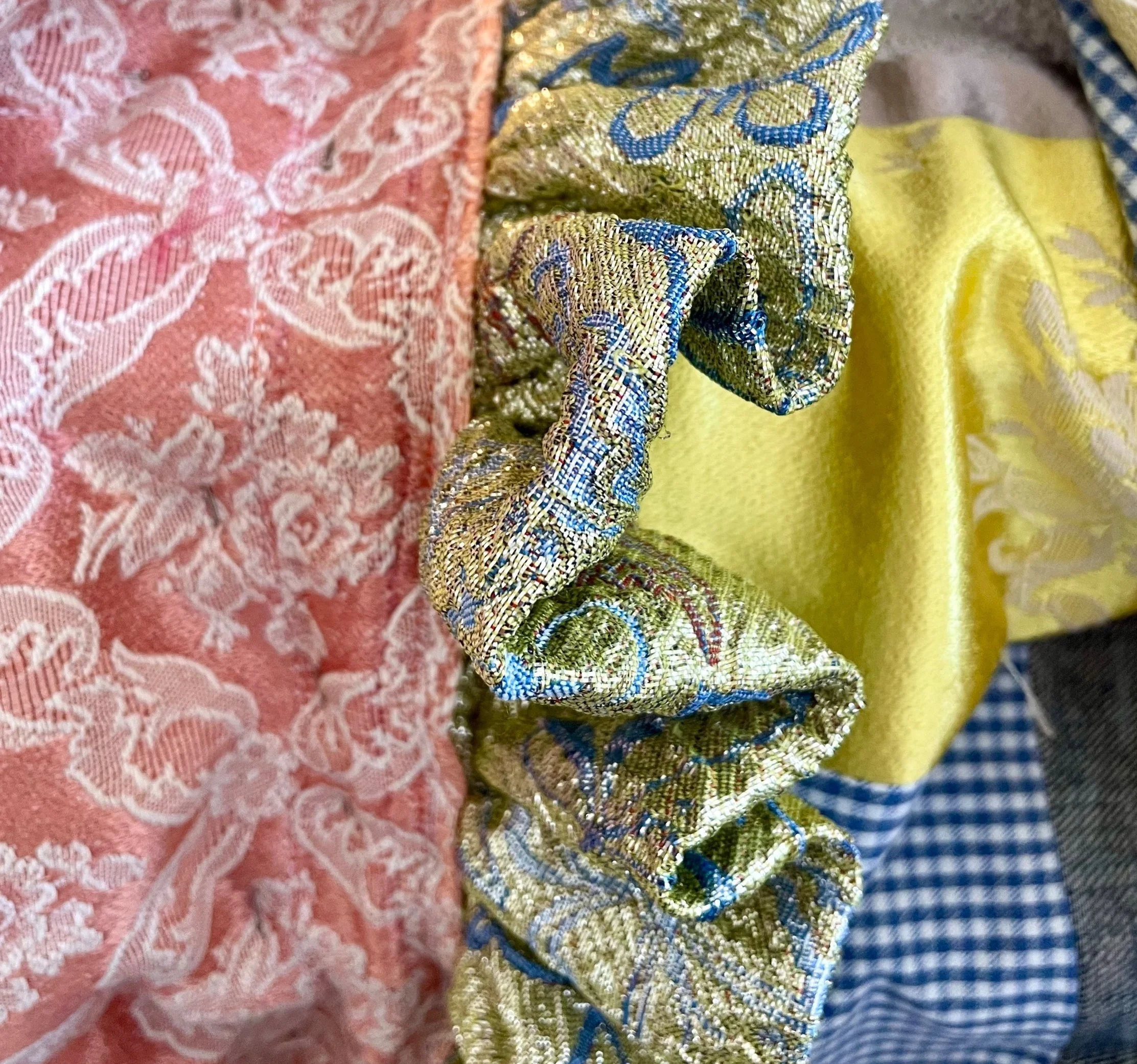 I needed something to cut the midline of the piece, where the two halves come together. I had some deadstock metallic jacquard, which was gold, but had a blue pattern through it. I only had a small piece of the fabric, I decided to gather it as an extra tactile element and also as it is so luxurious, it seemed like I should try and give it some shape, as it has some stiffness to the fabric.