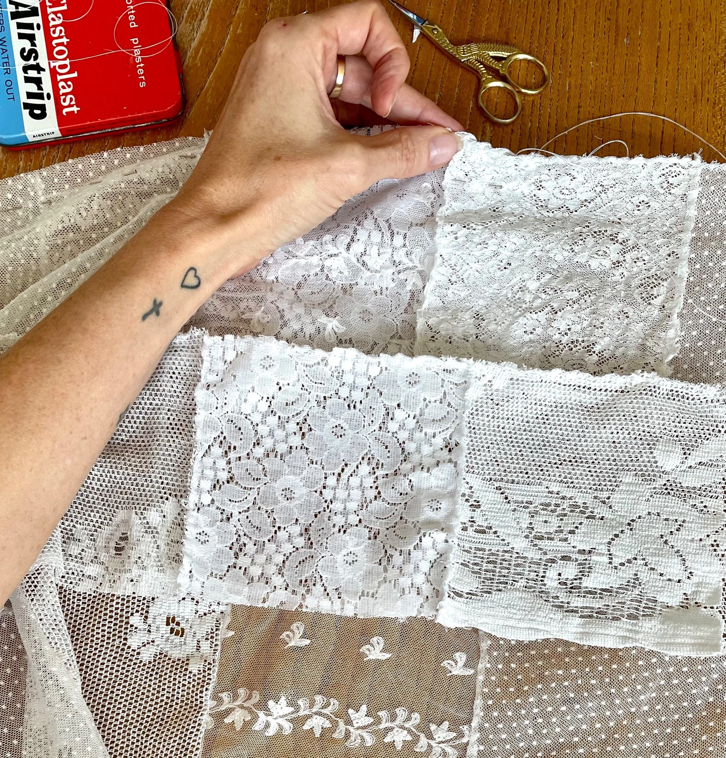 Hand sewing the lace squares together is time consuming. Whilst sewing my mind is drawn to the woman who painstakingly made some of the lace by hand, many years ago. I felt momentarily connected to these women, like a stitch in time. Our hands have handled and sewn this same piece of lace. When they made it they could never have dreamt of this moment in the future, that I would be sitting contemplating, imagining this person, perhaps she sat alone or perhaps worked in a group with other women. Did they drink tea and chat whilst making? Did she doubt her work? She needn’t have.